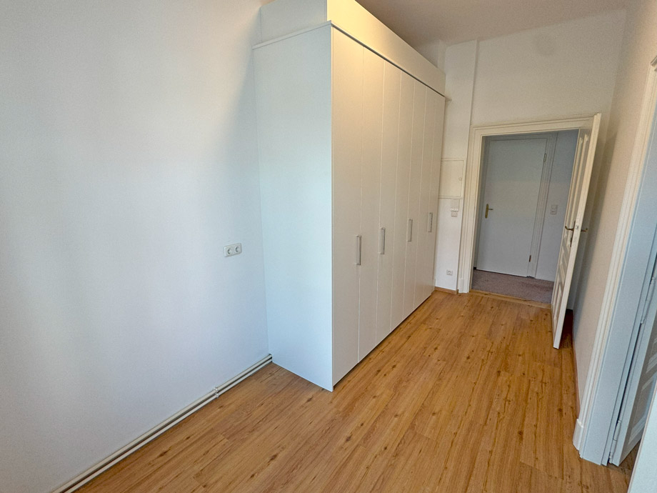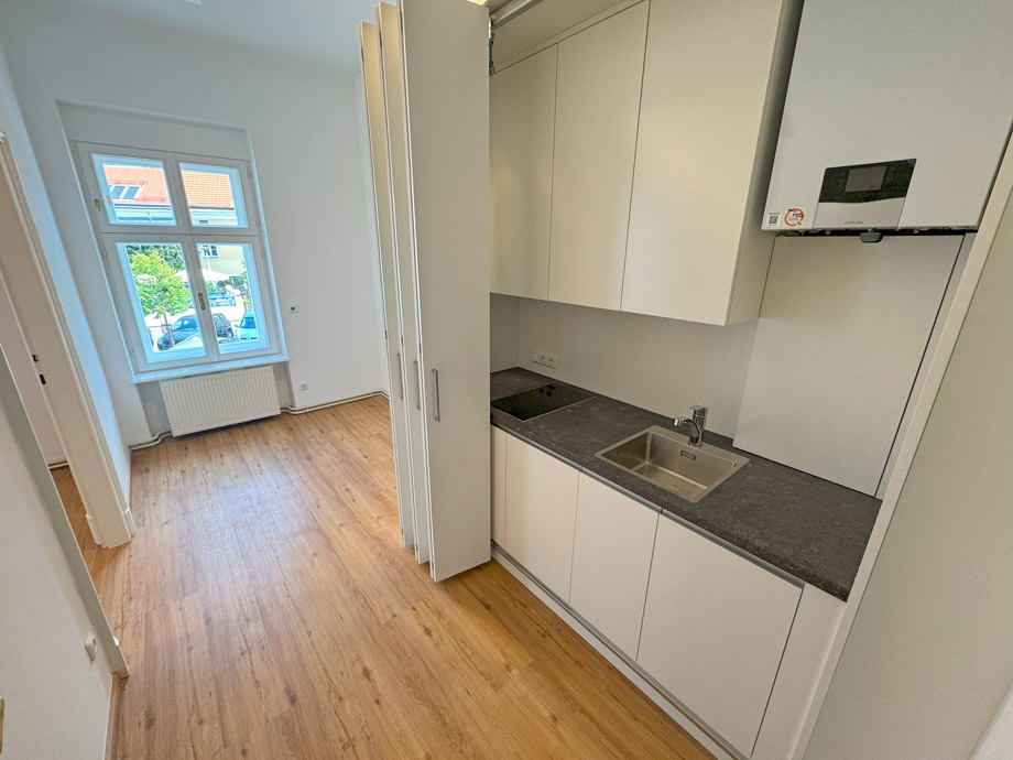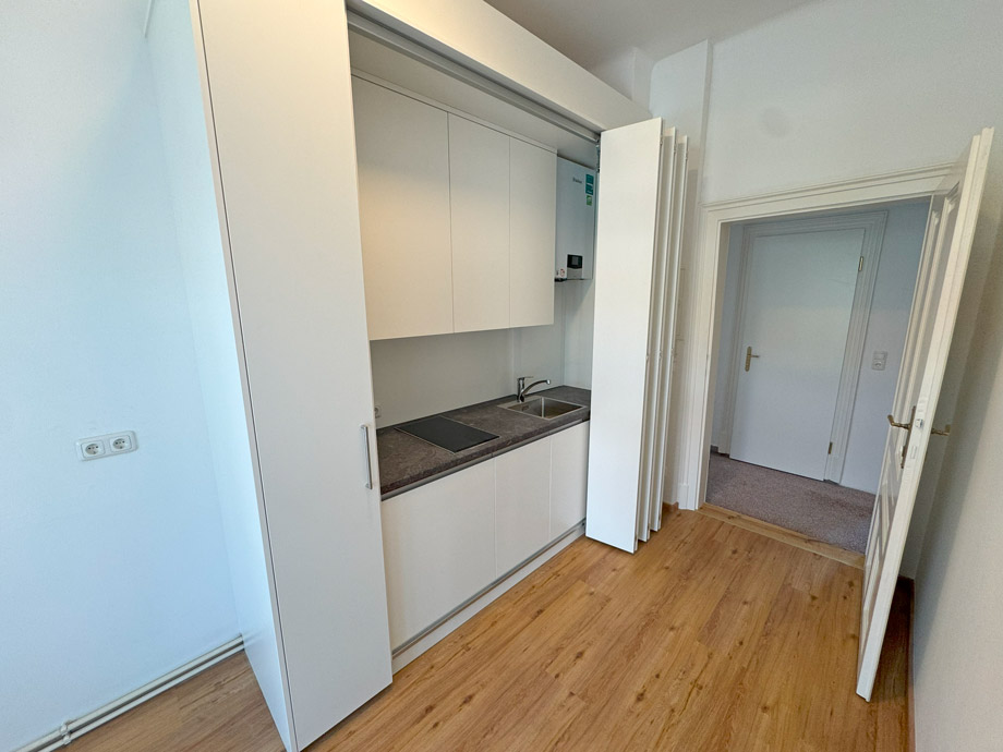 Besonders durchdacht ist die neue Einbauküche, die mit sämtlichen Geräten ausgestattet ist. Eine verschiebbare Front ermöglicht es, die Küche bei Bedarf komplett zu verdecken, sodass sie optisch wie ein geschlossener Kasten wirkt – ideal für eine diskrete Integration in den Büroalltag. Der vorhandene Schreibtisch kann auf Wunsch übernommen werden.