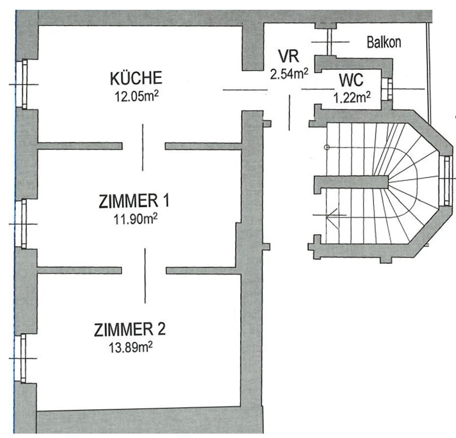 Die Raumaufteilung umfasst ein Vorzimmer, einen Küchenraum mit Platz für einen kleinen Empfangsbereich oder Esstisch, zwei gut geschnittene Büroräume sowie ein neues separates WC mit Handwaschbecken und Fenster. Ein weiteres Highlight ist der etwa 3 m² große Balkon, der zum ruhigen Innenhof ausgerichtet ist – perfekt geeignet für kurze Pausen oder einen Moment frischer Luft.