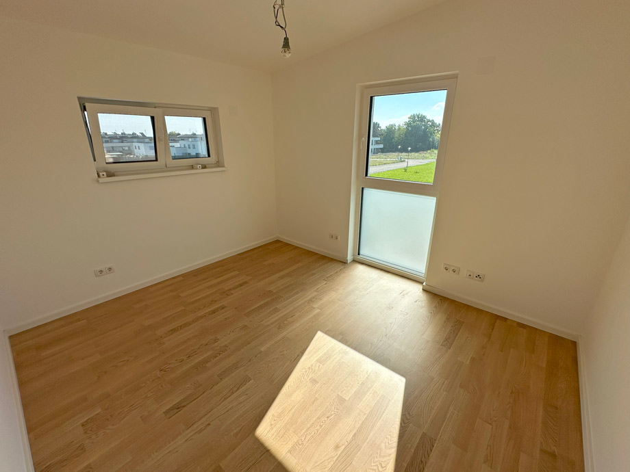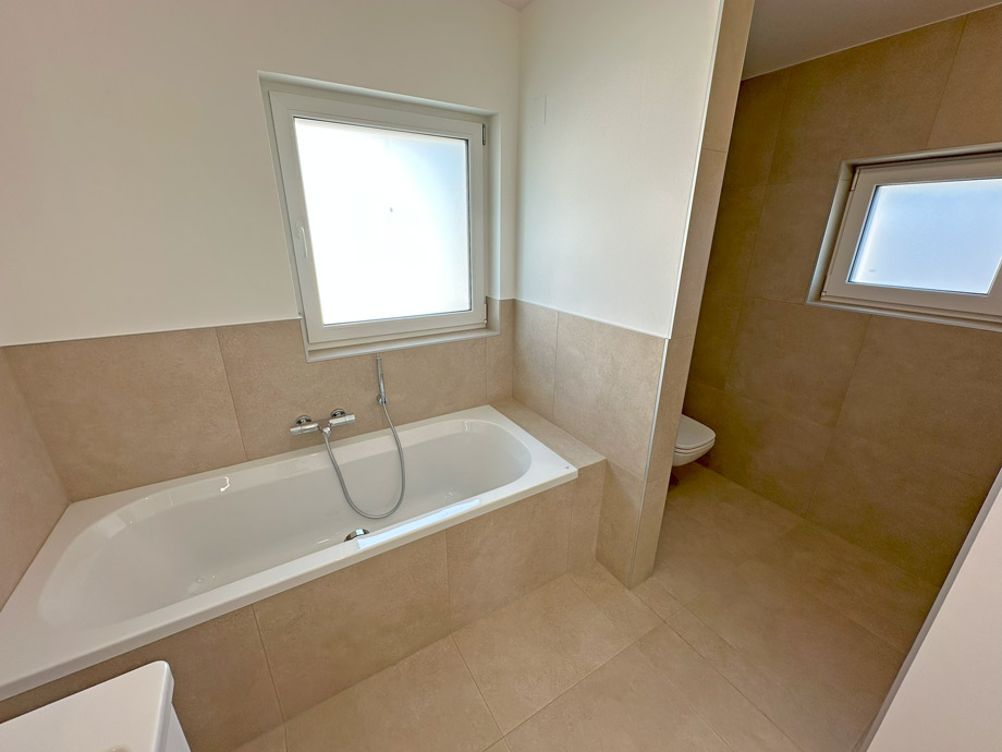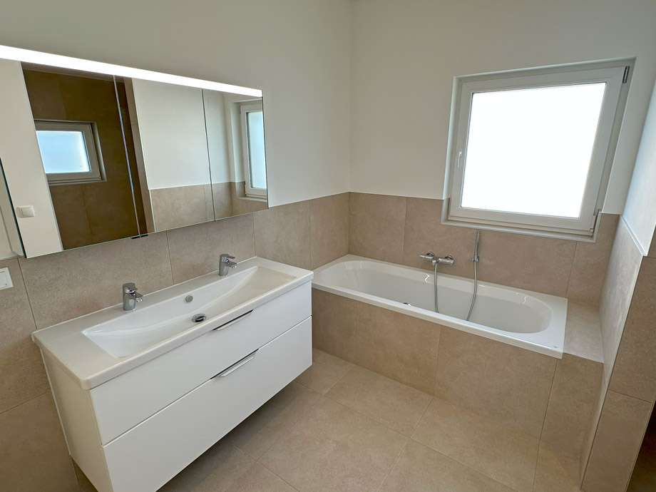 Im Obergeschoss sorgt das Pultdach mit einer variierenden Raumhöhe zwischen 2,30 m und 3,20 m für ein offenes Raumgefühl. Alle Schlafzimmer sind mit Eichenparkettböden ausgestattet, in einem der drei Schlafzimmer steht ein begehbarer Schrankraum zur Verfügung. Das Badezimmer ist ausgestattet mit einer bodenebenen Dusche, einer Badewanne, einem großem Doppelwaschbecken mit Unterschrank und Spiegelschrank sowie zwei Fenster in verschiedene Himmelsrichtungen.
