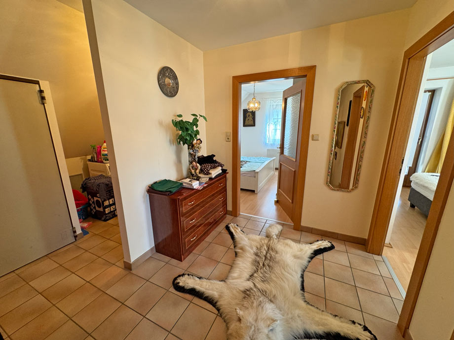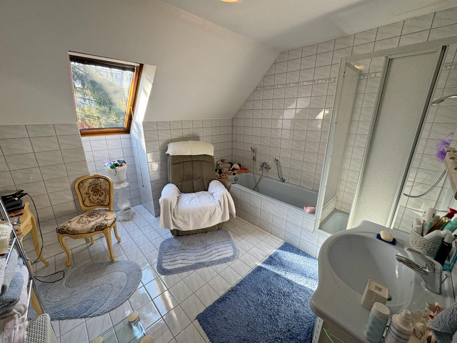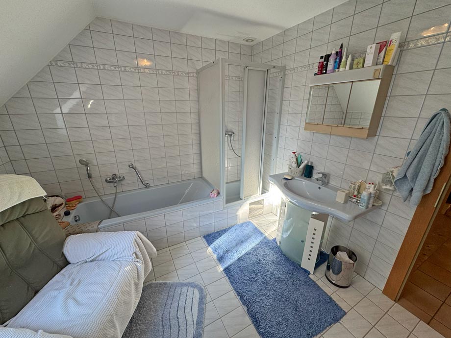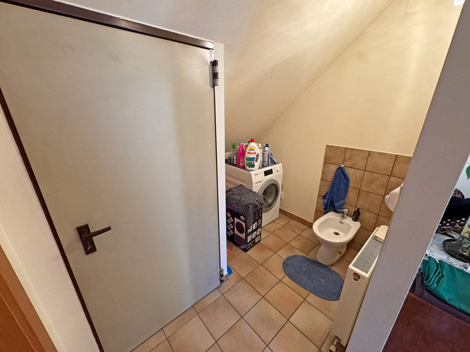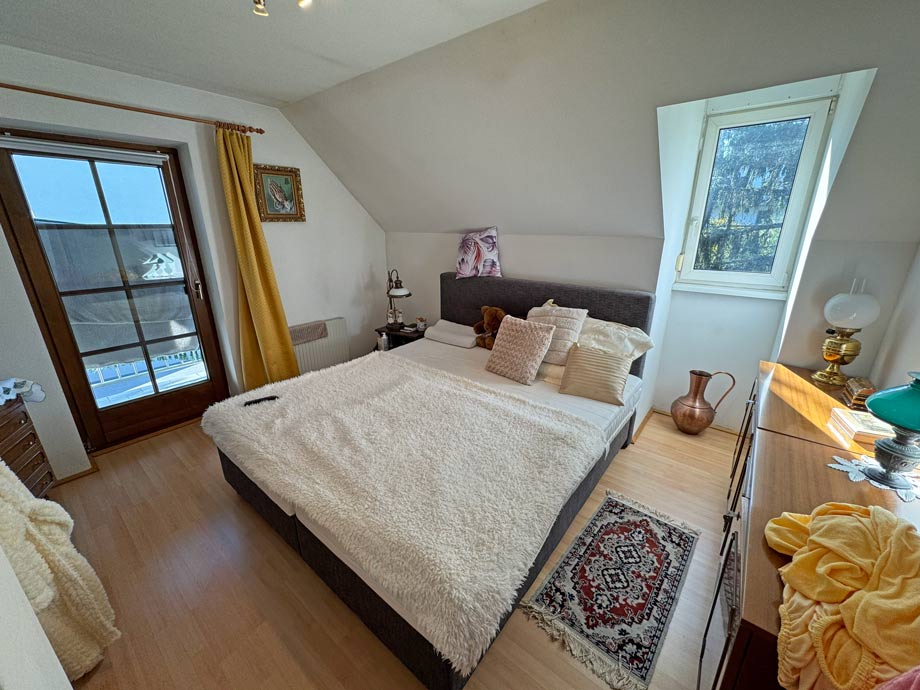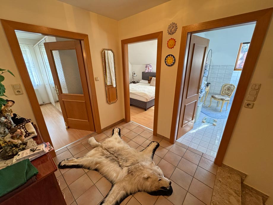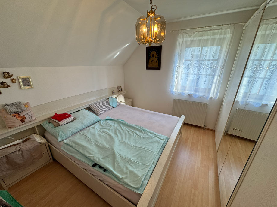 Im OG befinden sich ebenso ein zentraler Vorraum, ein Kinderzimmer mit etwa 11,7 m², ein Schlafzimmer mit ca. 15 m² und eigener Loggia, ein Badezimmer mit Dusche, Badewanne und Fenster sowie ein separates WC. Ein Waschmaschinenanschluss befindet sich ebenso im Obergeschoss.