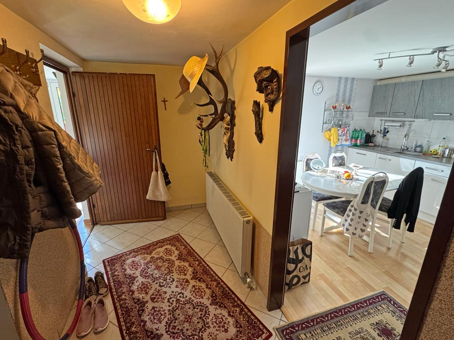 Über einen zentralen Vorraum mit genügend Platz für eine Garderobe sind sämtliche Räumlichkeiten zu betreten: ein etwa 32,5 m² großes Wohn-/Esszimmer mit direktem Ausgang auf den großen Balkon, eine vom Wohnbereich separierte Küche mit Speis, extra WC mit Handwaschbecken sowie eine Garage für ein Auto mit direkten Hauszugang.