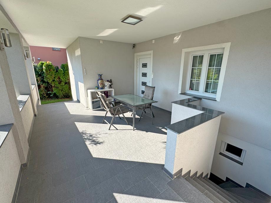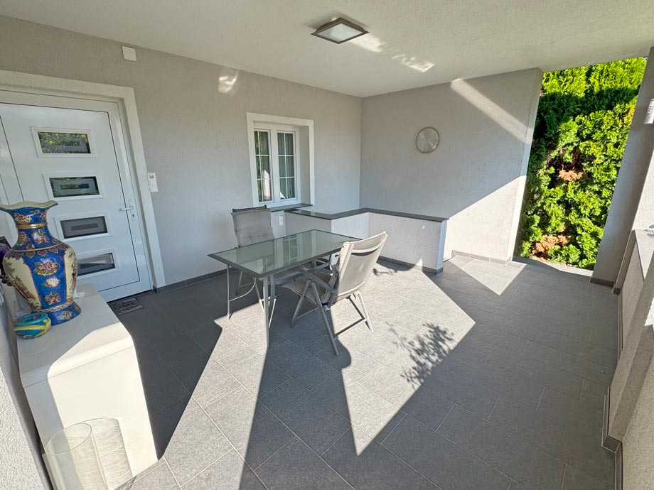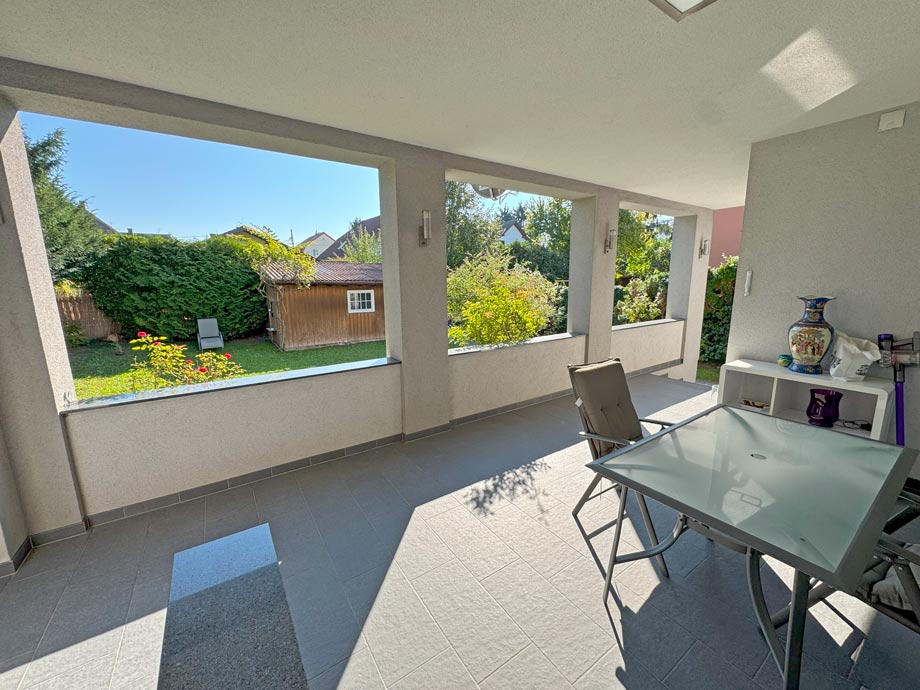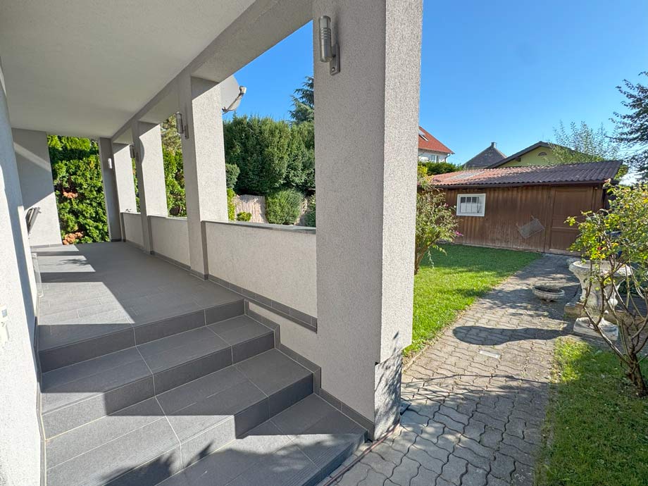 Der Zugang zum Haus kann wahlweise über den Garten oder nahezu vollständig überdacht über die Garage und die Terrasse erfolgen. Die rund 23 m² große Terrasse ist vollständig überdacht und kann so über weite Teile des Jahres als erweiterter Wohn- und Aufenthaltsbereich genutzt werden.