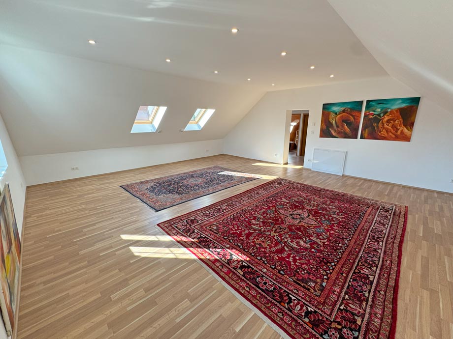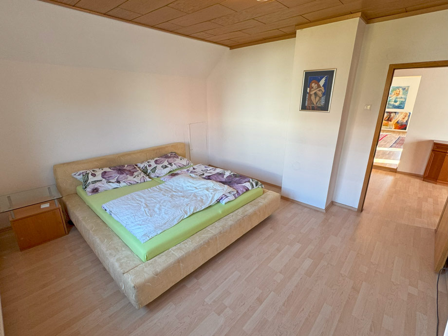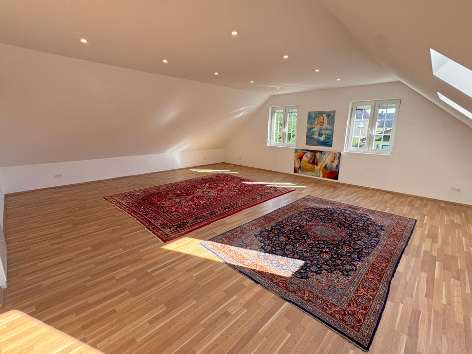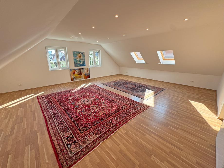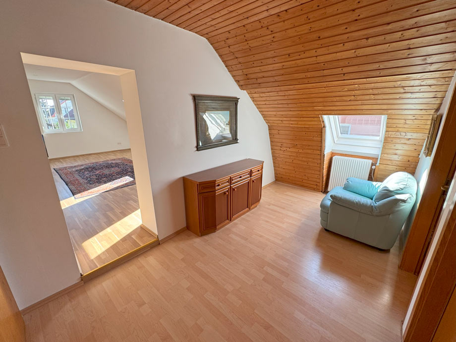 Das Obergeschoss erschließt sich über einen großzügigen Vorraum. Von hier gelangt man in einen besonders großen Wohnraum mit rund 54 m², der durch den Dachausbau neu entstanden ist und über eine Fußbodenheizung verfügt. Der Blick in den eigenen Garten und das umgebende Grün schafft eine angenehme Wohnatmosphäre. Aufgrund der günstigen Fensteranordnung besteht die Möglichkeit, diesen Raum in zwei getrennte Wohnräume zu unterteilen. Zusätzlich steht im Obergeschoss ein Schlafzimmer mit etwa 15,75 m² sowie ein kleiner Sanitärraum mit WC zur Verfügung. Verkleidete Dachbodenräume bieten zusätzlichen Stauraum.