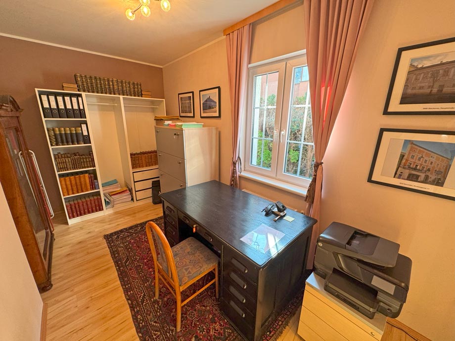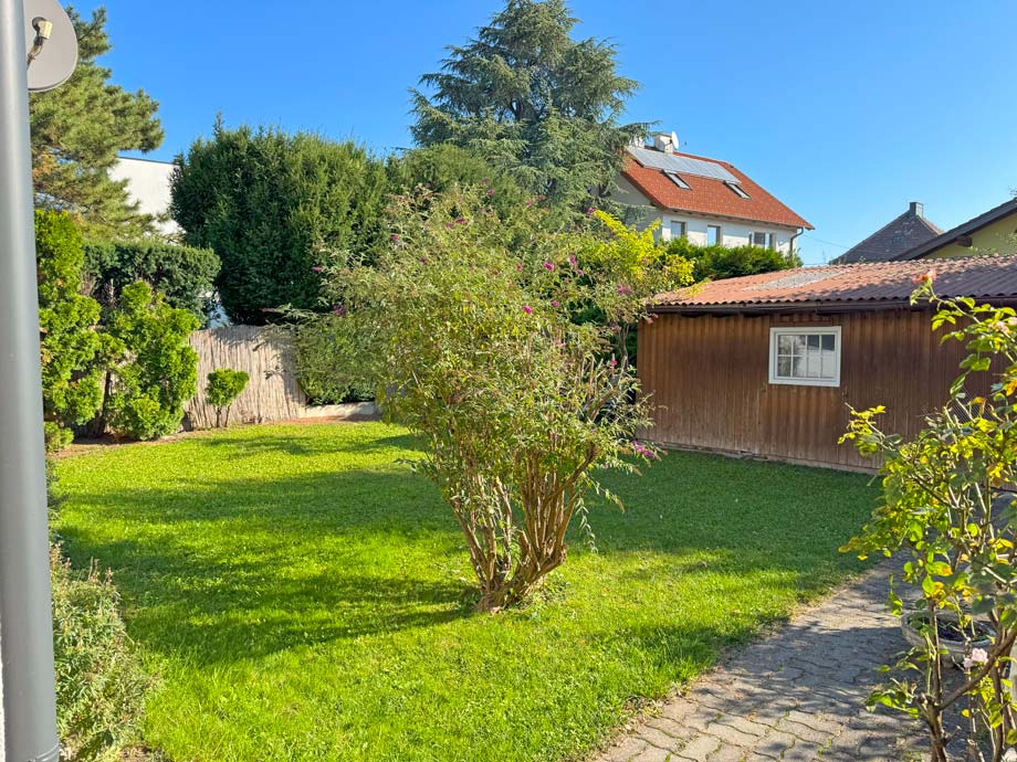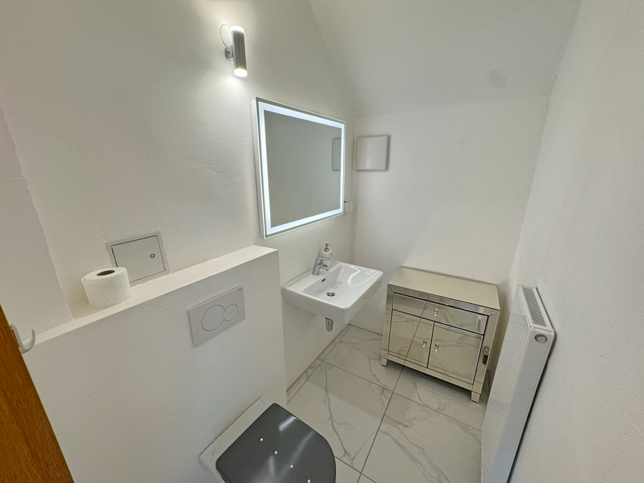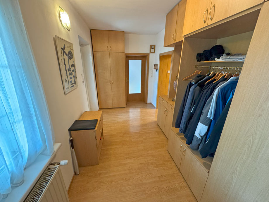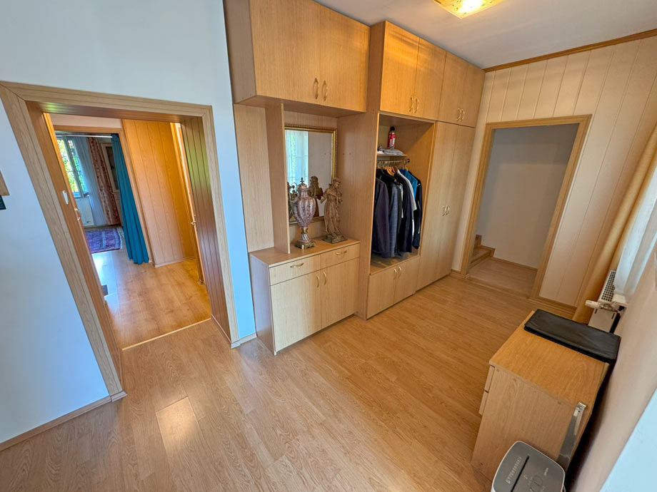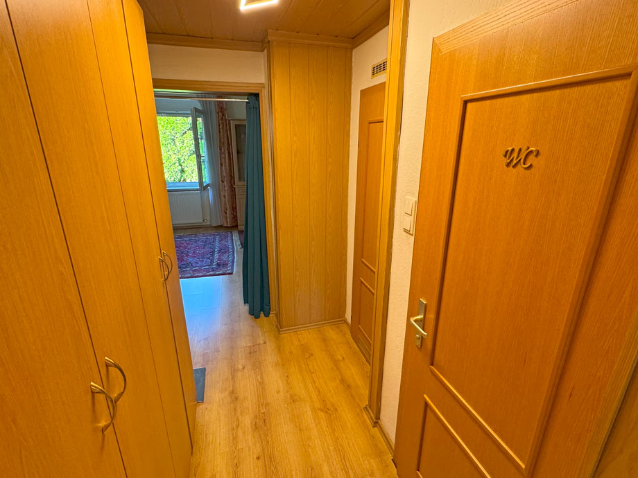 Das Obergeschoss erschließt sich über einen großzügigen Vorraum. Von hier gelangt man in einen besonders großen Wohnraum mit rund 54 m², der durch den Dachausbau neu entstanden ist und über eine Fußbodenheizung verfügt. Der Blick in den eigenen Garten und das umgebende Grün schafft eine angenehme Wohnatmosphäre. Aufgrund der günstigen Fensteranordnung besteht die Möglichkeit, diesen Raum in zwei getrennte Wohnräume zu unterteilen. Zusätzlich steht im Obergeschoss ein Schlafzimmer mit etwa 15,75 m² sowie ein kleiner Sanitärraum mit WC zur Verfügung. Verkleidete Dachbodenräume bieten zusätzlichen Stauraum.